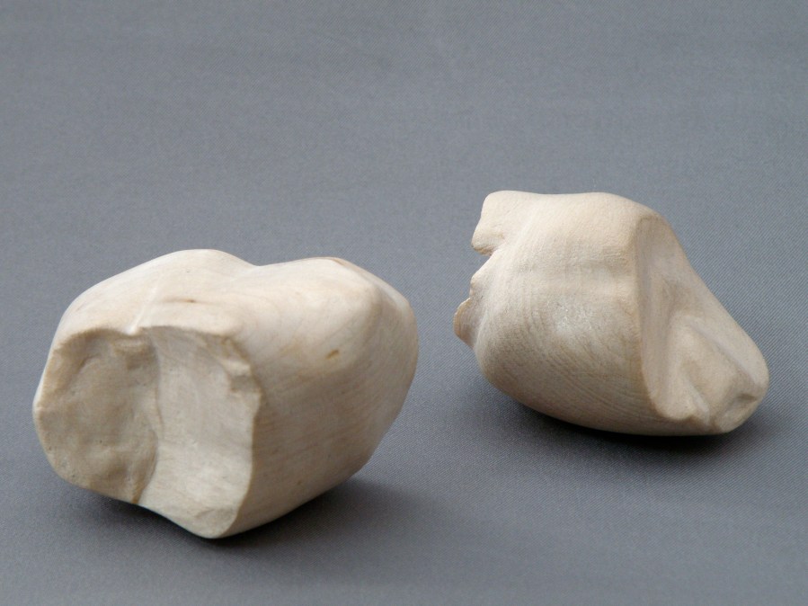 Baby Teeth, 2011. Bass wood. 1.5×1.5×2.5″ each. *SOLD* Baby Teeth recalls an unpleasant physical memory of losing a tooth. Even while typing this I make a face.